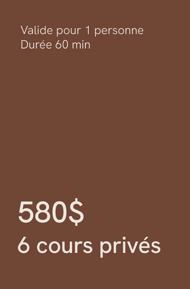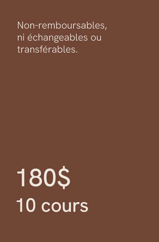 Tous les services, y compris les cours à la carte, les ateliers, les forfaits mensuels, les cours privés et les certificats cadeaux, sont non remboursables et non échangeables. Les cours à la carte sont valables pendant 12 mois et sont non transférables.